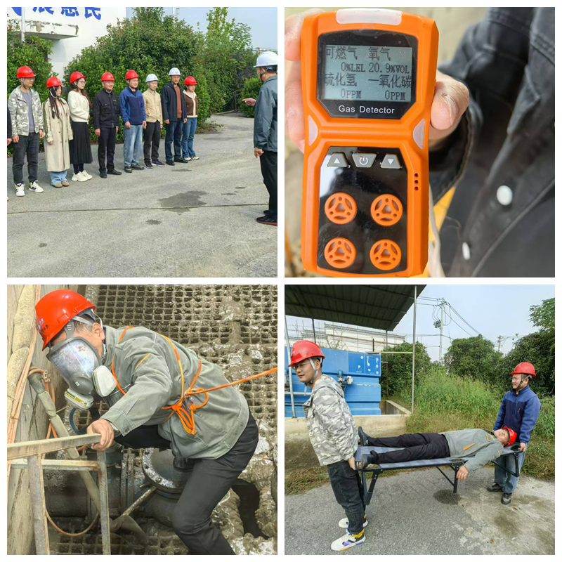 南陵水務組織有限空間作業救援應急演練活動。演練開始前,公司組織全體員工進行了有限空間作業安全知識培訓,并進行演練前準備工作,嚴格執行“先通風、再檢測、后作業”的安全生產原則。