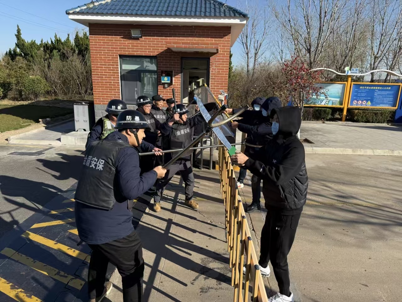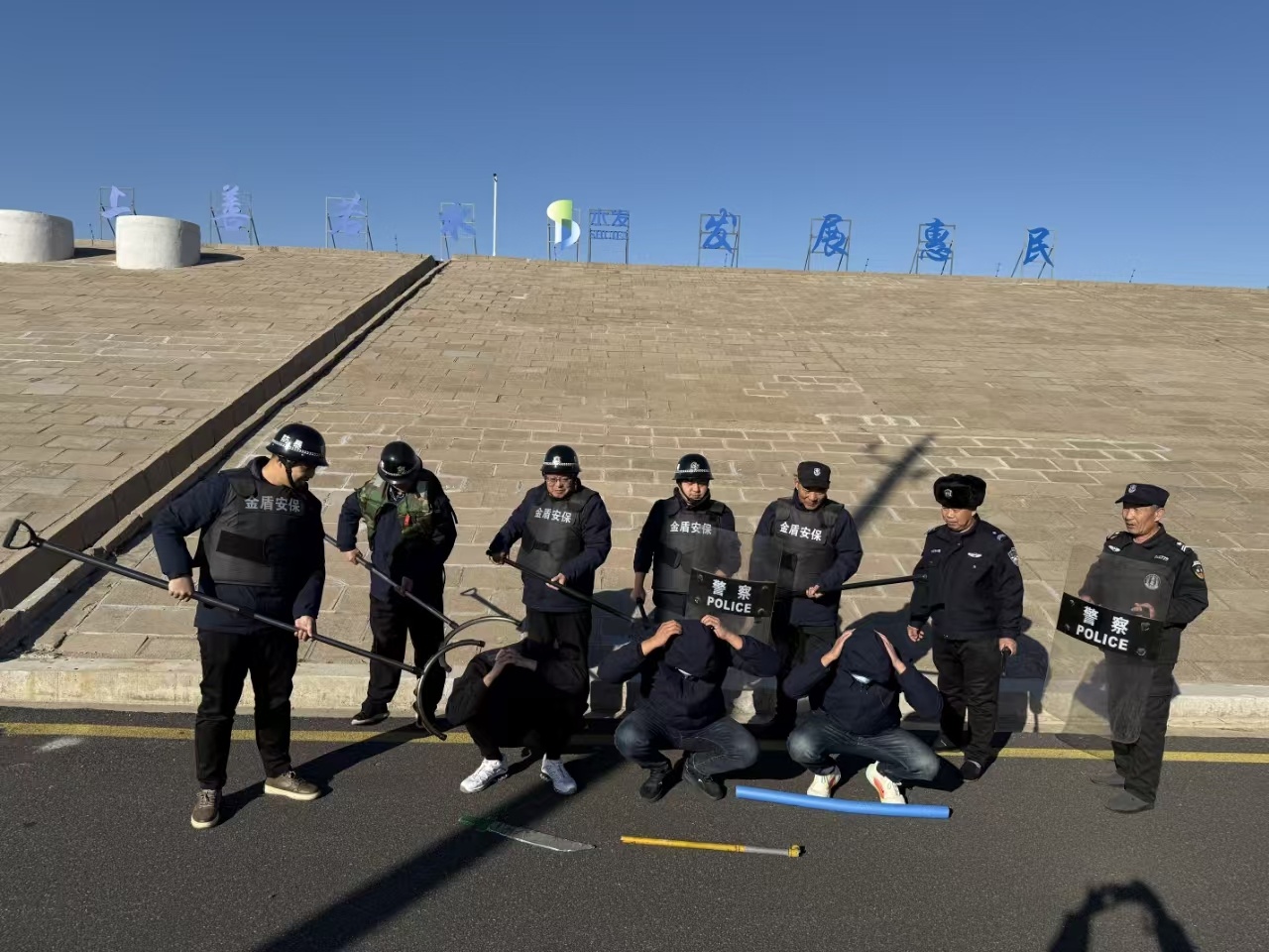 本次演練模擬了三名恐怖嫌疑人攜帶管制刀具強行闖入第一平原水庫、惠澤水廠加藥間,企圖破壞水庫防汛設施、投毒并實施暴力活動的場景。值班人員發現可疑人員后,立即上報公司領導,同時啟動應急預案,并攜帶防刺服、盾牌、鋼叉等防暴裝備趕往現場,對嫌疑人實施圍捕。經過一番激烈搏斗,最終成功制服嫌疑人。