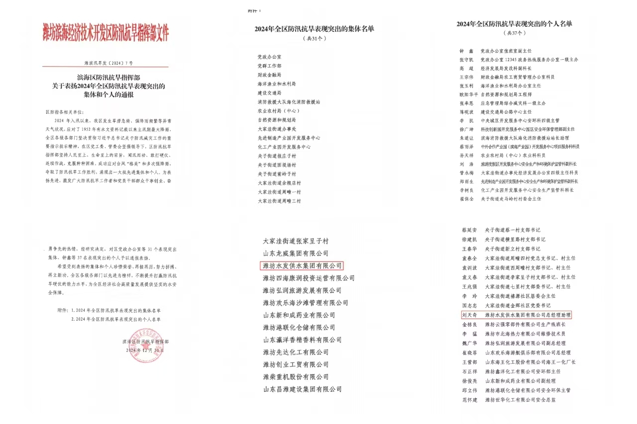 近日,濰坊市濱海區(qū)防汛抗旱指揮部下發(fā)《關(guān)于表揚(yáng)2024年全區(qū)防汛抗旱表現(xiàn)突出的集體和個人的通報(bào)》,濰坊水發(fā)供水集團(tuán)及公司員工劉天奇,分別榮獲防汛抗旱表現(xiàn)突出的集體和個人表彰。