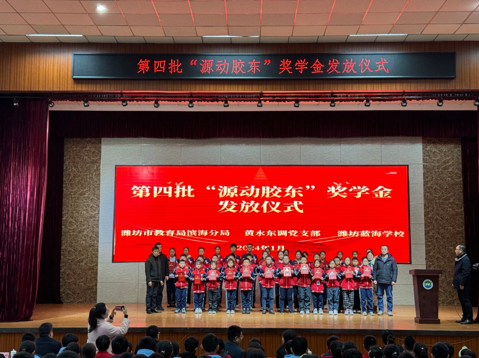 1月17日下午,黃水東調黨支部聯合濰坊藍海學校在藍海學校行政樓報告廳舉行了第四批“源動膠東”獎學金頒發儀式,對藍海學校2023學年榮獲獎學金的42名優秀學生進行表彰。濱海區教育分局黨組成員、副局長袁玉松,山東水發黃水東調工程有限公司黨支部書記、董事長申勇,總經理宋致軍,濰坊藍海學校黨支部書記、校長楊偉平等出席,共計300余名師生參加此次活動。