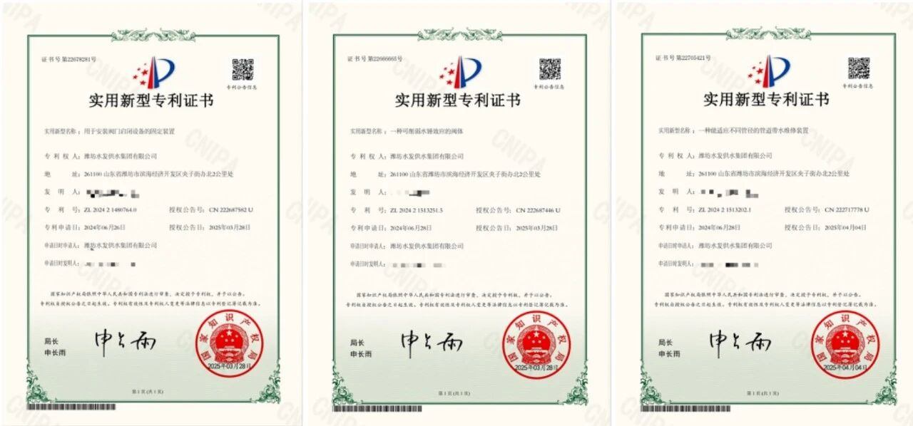 此外,濰坊區域還新增3項實用新型專利,涵蓋設備安裝、系統防護與維修維護等多個應用場景:《用于安裝閥門啟閉設備的固定裝置》提升了復雜環境下的施工效率;《一種可削弱水錘效應的閥體》增強了供水系統穩定性;《一種能適應不同管徑的管道帶水維修裝置》實現了高效不停水維修。三者與前述發明專利、軟著協同發力,初步構建起“檢測-控制-維護”的水務管網技術創新體系。